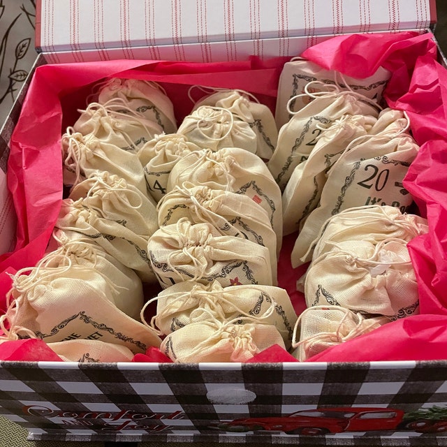 🎁 Bags can be displayed on a fireplace mantel, a bookshelf, in a Christmas basket, hung with twine and clothespins, or take one out each morning at breakfast as a surprise! Wrap your gift in tissue before placing in the bag for a fuller appearance.