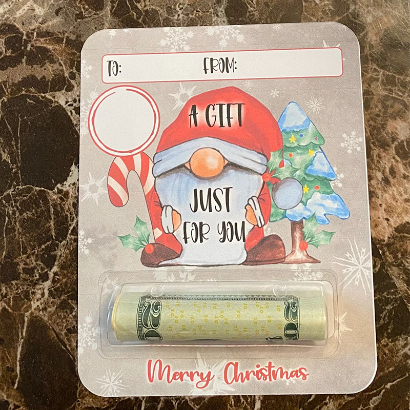 Simply roll your money, place it into the plastic money holder and adhere it to the card by removing the protective covering for the adhesive. There is an easy to use rectangle that will guide you in placing your rolled up money in the right spot!