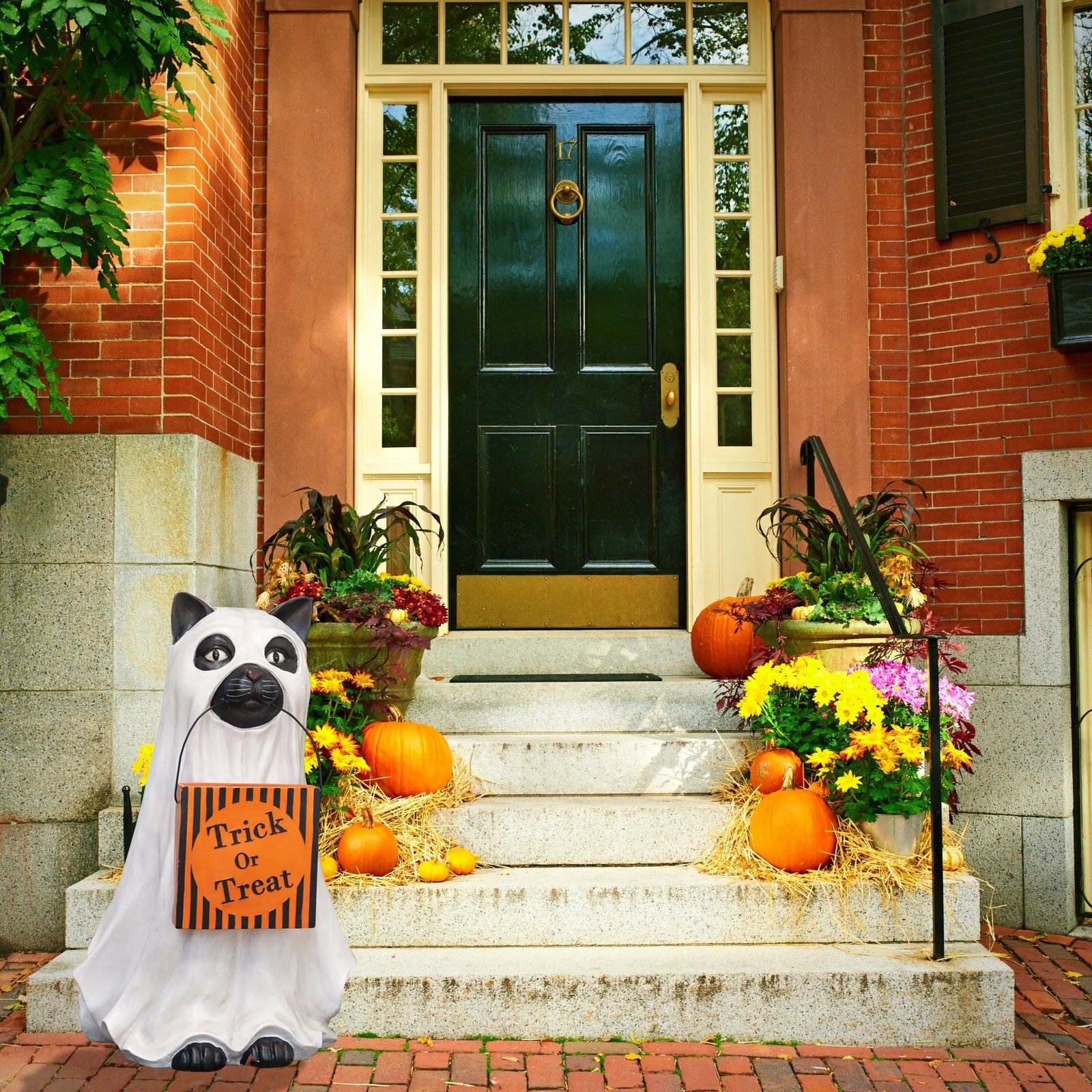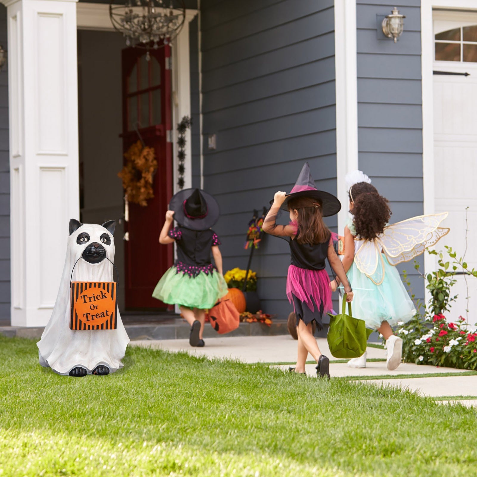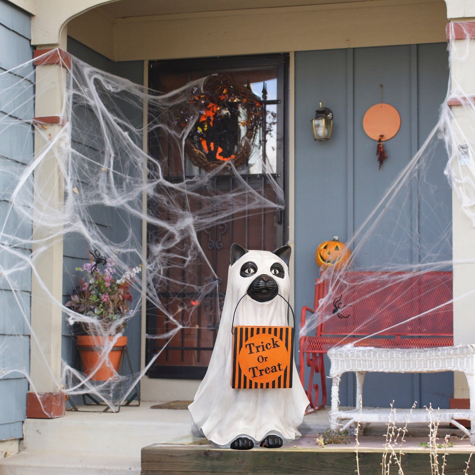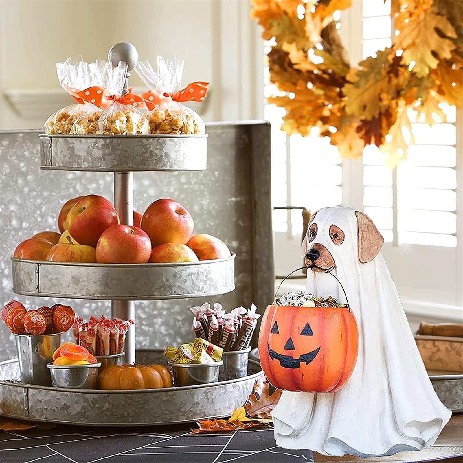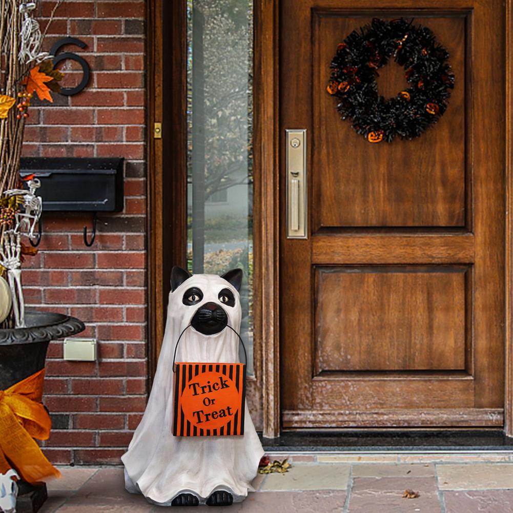 【Ghost Cat/ Dog Candy Bowl】Welcome to trick-or-treaters dressed as ghosts on your front steps with your dog or cat. Faithful and true, this pup is ever helpful too, carrying a giant pumpkin bowl that can easily be filled with treats through a chute at the back. Get your guests into the Halloween spirit with this lovable canine companion.