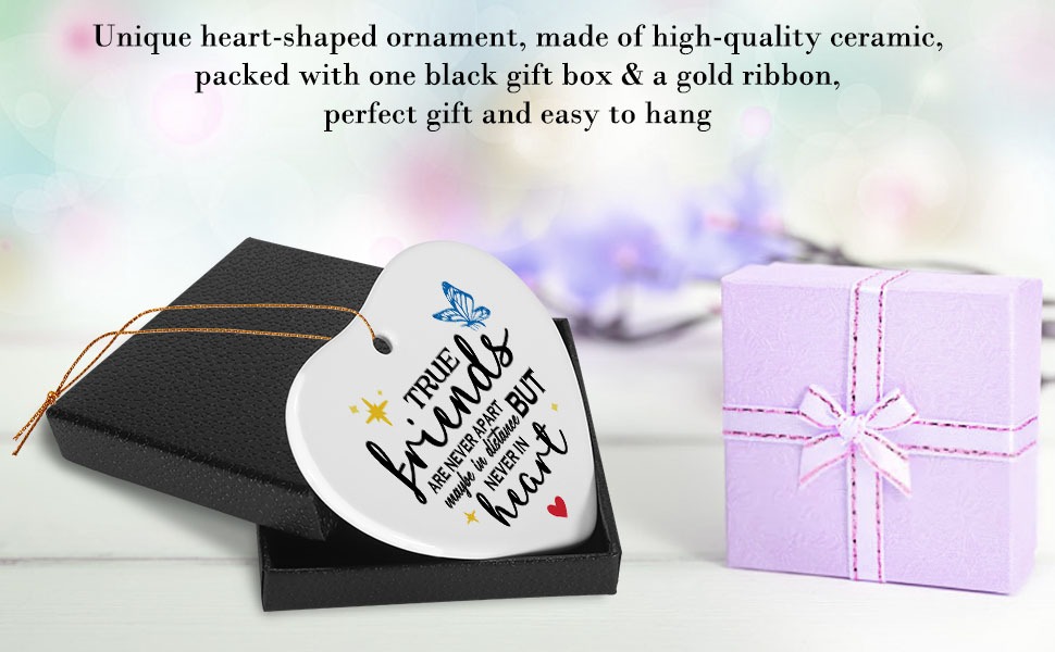 Unique heart-shaped ornament, made of high-quality ceramic, packed with one black gift box & a gold ribbon, perfect gift and easy to hang.