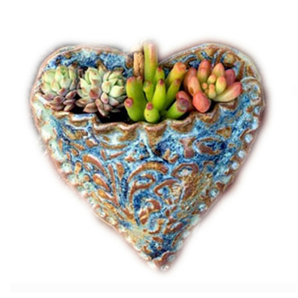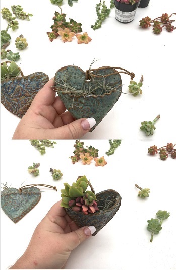 Can’t you imagine a tree filled with these succulent hearts in all different colors? Cool, denim blue and teal glaze, and semi-rusty colored tracings. The other is a lighter version of the same colors for a pretty pairing.